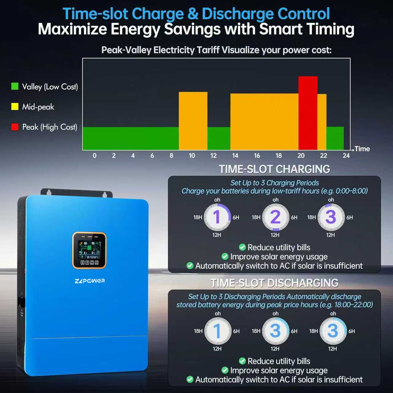 The GS 8kw-12kw 48VDC to 220VAC hybrid solar inverter from ZLPOWER is made for both inductive and resistive loads. This lets such models manage lights and air conditioners well.