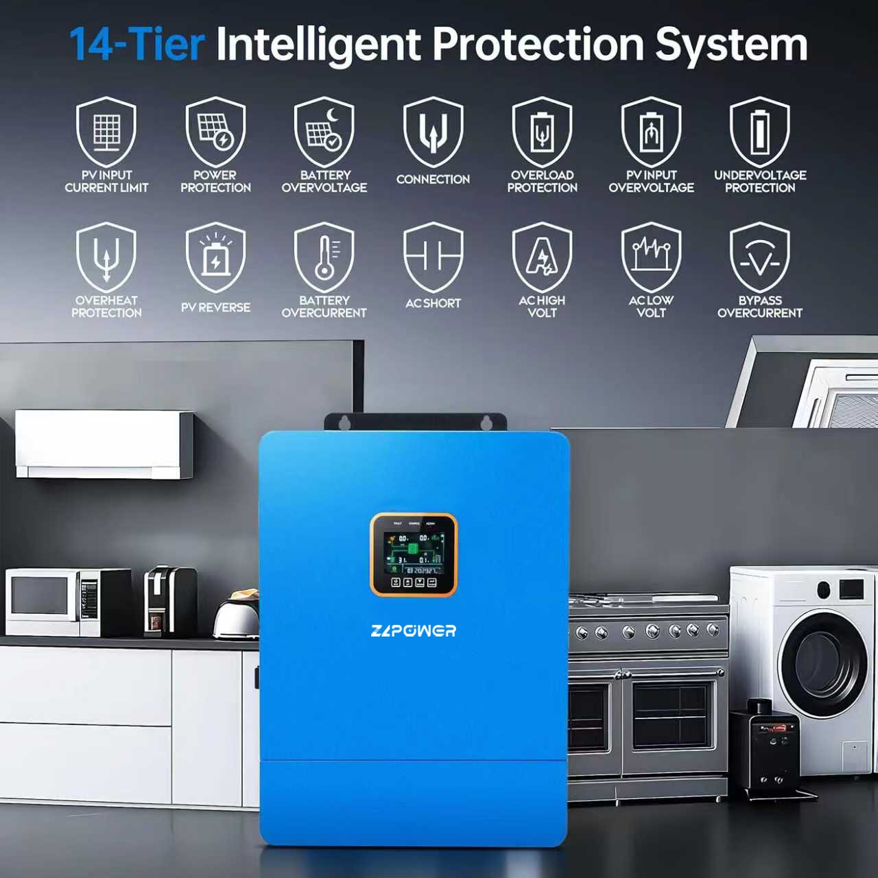 The GS 8kw-12kw 48VDC to 220VAC hybrid solar inverter from ZLPOWER is made for both inductive and resistive loads. This lets such models manage lights and air conditioners well.